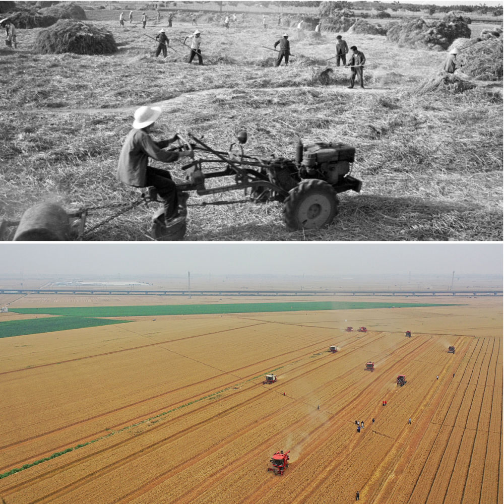 拼版照片:上圖為1982年,河南沈丘紙店公社紙店大隊(duì)13生產(chǎn)隊(duì)的社員用集體的手扶拖拉機(jī)碾打小麥(新華社記者 朱廣智 攝);下圖為2024年6月5日,河南省安陽市滑縣舉行小麥機(jī)收減損技能大比武活動(dòng),旨在規(guī)范節(jié)糧減損操作技能,減少糧食在收割環(huán)節(jié)的損失(新華社記者 郝源 攝)。