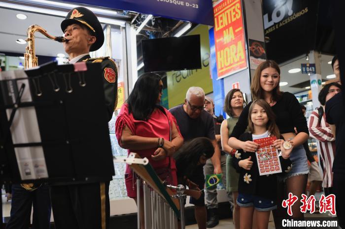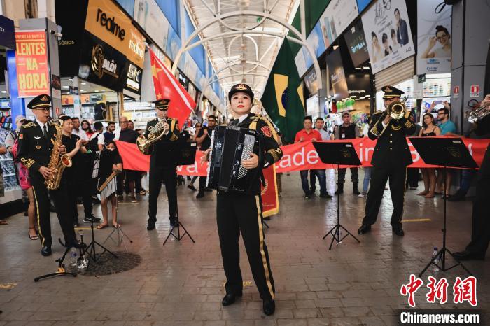 當(dāng)?shù)貢r(shí)間9月21日,巴西首都巴西利亞,參加中國(guó)軍事文化周活動(dòng)的中國(guó)人民解放軍軍樂團(tuán)演出分隊(duì),在巴西利亞小商品市場(chǎng)演出,民眾互動(dòng)熱烈。琚振華 攝