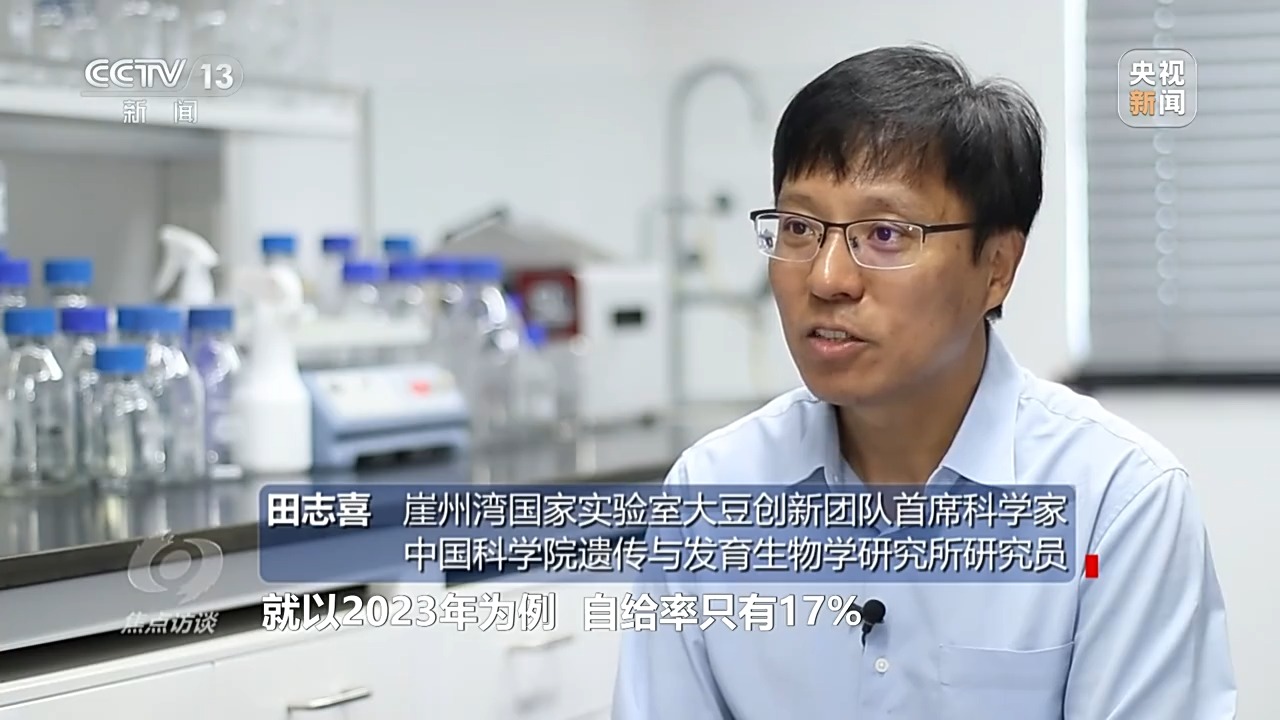 崖州灣國家實驗室大豆創(chuàng)新團隊首席科學家、中國科學院遺傳與發(fā)育生物學研究所研究員 田志喜:中國大豆的自給率太低了,以2023年為例,只有17%,在這種情況下,保證我們糧食安全,大豆義不容辭、責無旁貸,提高它的自給率。