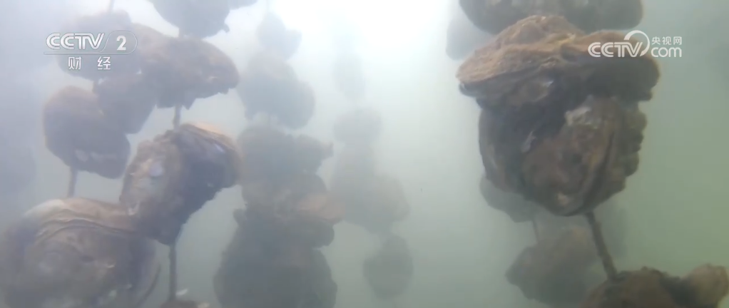 通過水下鏡頭可以看到,蠔苗被放下去的時候就固定在了水泥石餅上,每串石餅大約固著有40個。養(yǎng)殖戶們說,這種吊樣的方式不僅讓生蠔長得好,還能方便捕撈。像1.6畝大小的蠔排可以吊養(yǎng)蠔苗大概1.2萬串,整個基地蠔苗的年產(chǎn)量達13.45萬噸。