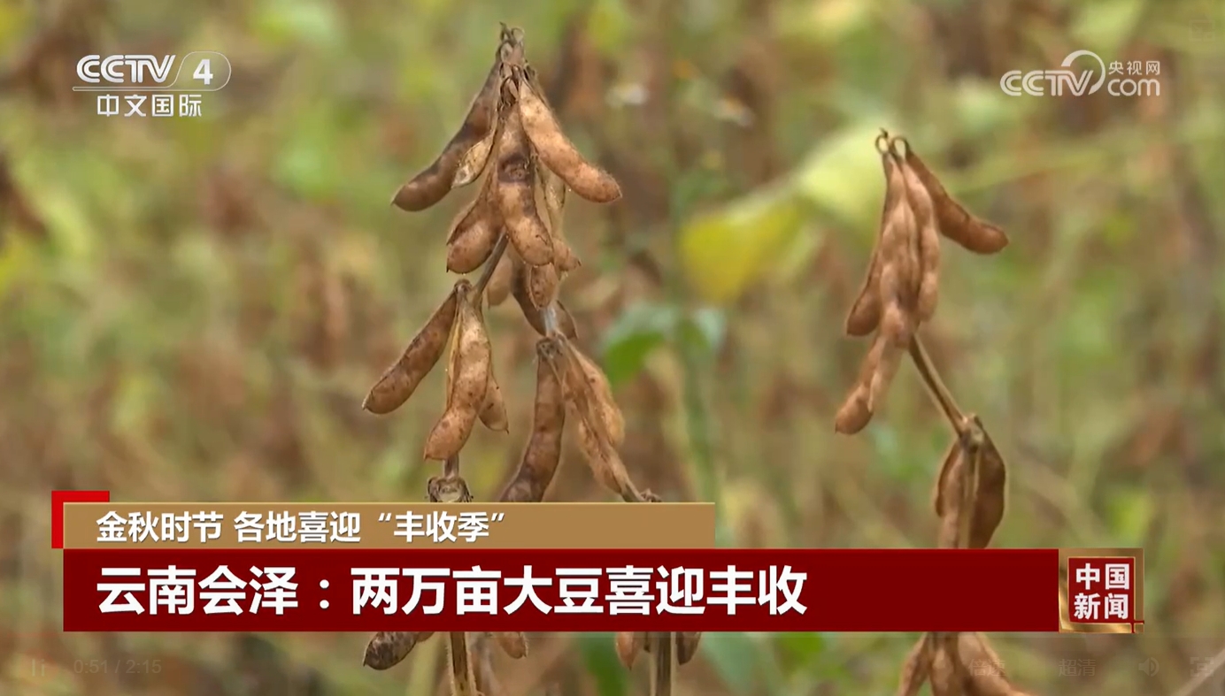 在烏蒙山間的云南會(huì)澤縣,兩萬多畝大豆喜迎豐收。在當(dāng)?shù)氐拇蠖狗N植示范區(qū)里,金黃的豆葉匯聚成一片金色海洋,飽滿圓潤(rùn)的大豆莢掛滿枝頭。