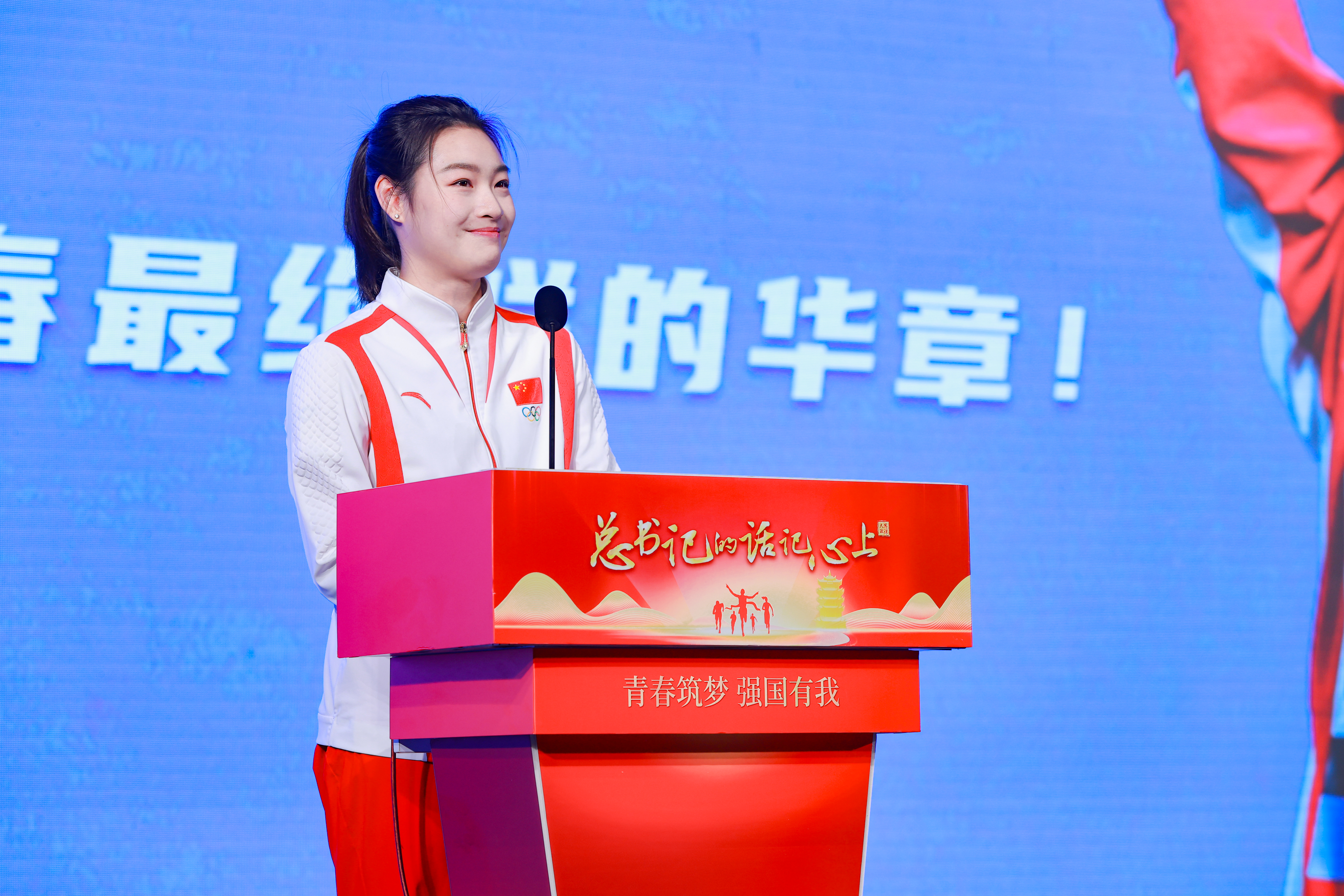 奧運冠軍昌雅妮驚喜亮相,一到現(xiàn)場就引起了學生們的歡呼與喝彩。她和同學們親密合影,引爆全場!接著,她登臺動情講述奪冠背后的故事:“從跳校到奧運冠軍,我的每一步都凝聚著汗水、淚水與堅持……”回憶起訓練的艱辛歷程,她幾度哽咽落淚,讓人心疼。決勝巴黎、綻放奧運的背后,是堅持的力量!昌雅妮以自己的切身經(jīng)歷,激勵青年學子:“只要有夢想,我們就不懼遠航,堅持的力量,將繪就青春最絢爛的華章!”
