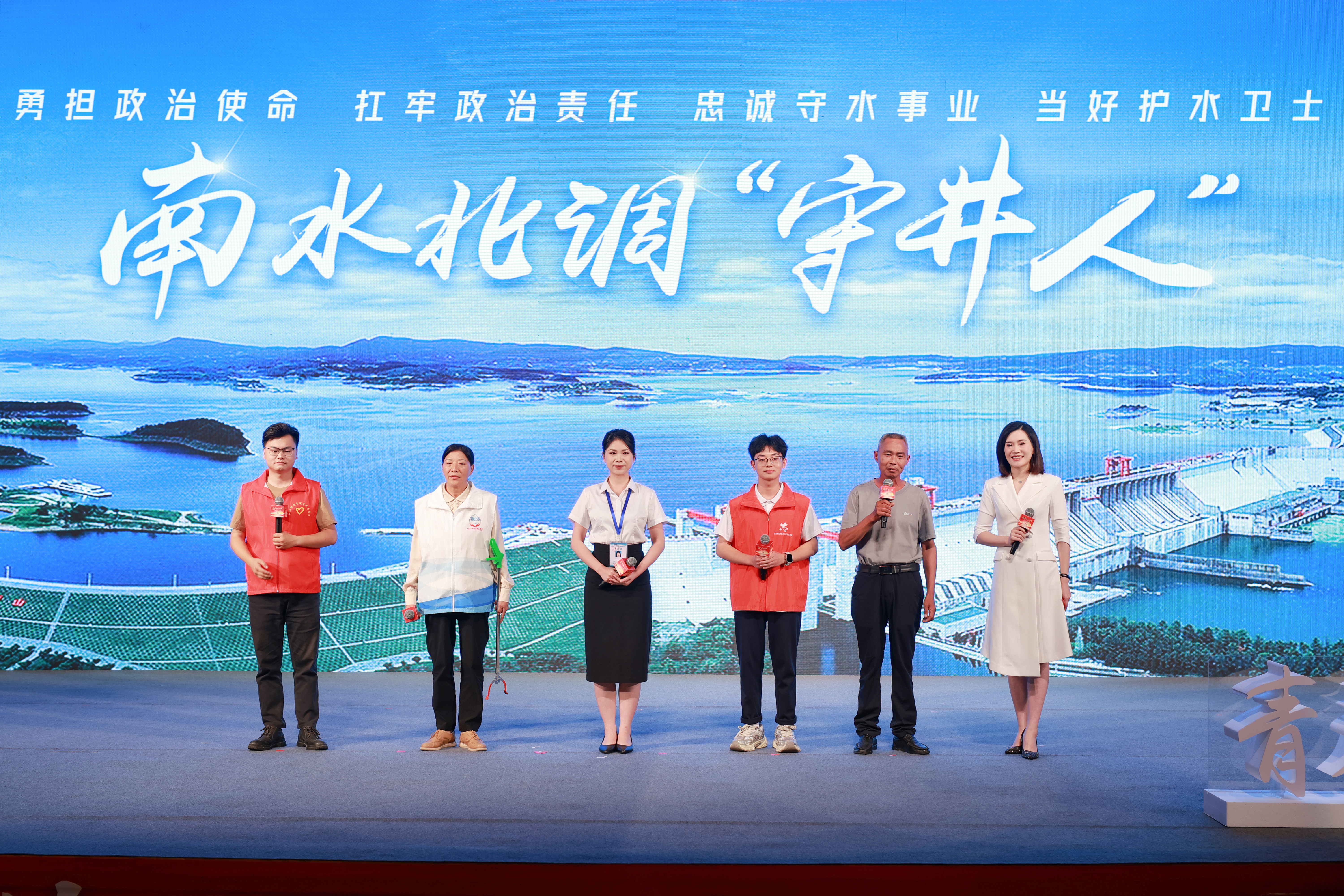 今年8月,一封來自習近平總書記的回信在丹江口庫區(qū)引起了強烈反響。丹江口守水護水志愿者吳勇分享《南水北調(diào)“守井人”》的故事:10年來,鄂西北的丹江口群眾一直堅持做著一件“點滴的事”,也是“天大的事”——確?!耙汇逅览m(xù)北送”!丹江口的守水調(diào)度員余丹、清漂員張旭春、護水員秦立萍、學生志愿者瞿德齊來到現(xiàn)場,并一起倡議:“踐行總書記的囑托,繼續(xù)弘揚志愿服務精神,當好‘守井人’,確?!汇逅览m(xù)北送’”!