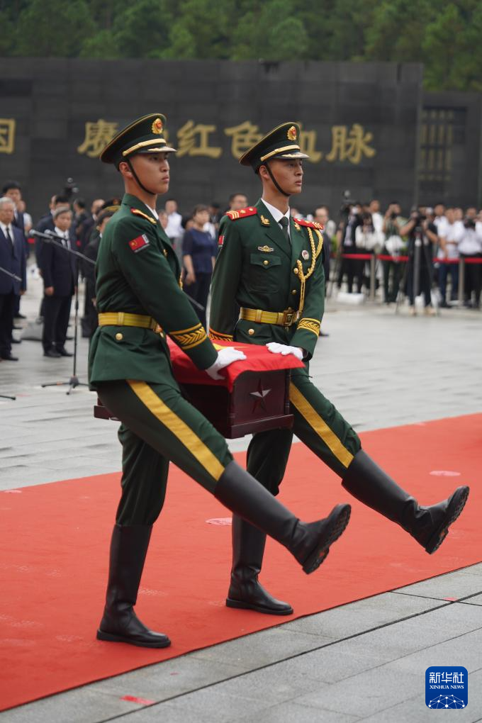隨著《思念曲》響起,在2名禮兵持槍護(hù)衛(wèi)下,2名禮兵護(hù)送黃公略烈士棺槨緩緩步入現(xiàn)場(chǎng)。全場(chǎng)奏唱中華人民共和國(guó)國(guó)歌。全體人員脫帽肅立,向烈士默哀。18名禮兵鳴槍3響,向烈士致敬。