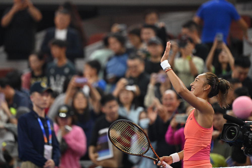9月28日,鄭欽文在賽后向觀眾致意。當(dāng)日,在北京進(jìn)行的2024中國(guó)網(wǎng)球公開賽女單第二輪比賽中,中國(guó)選手鄭欽文2:0戰(zhàn)勝俄羅斯選手拉希莫娃,晉級(jí)下一輪。新華社記者 張龍 攝
