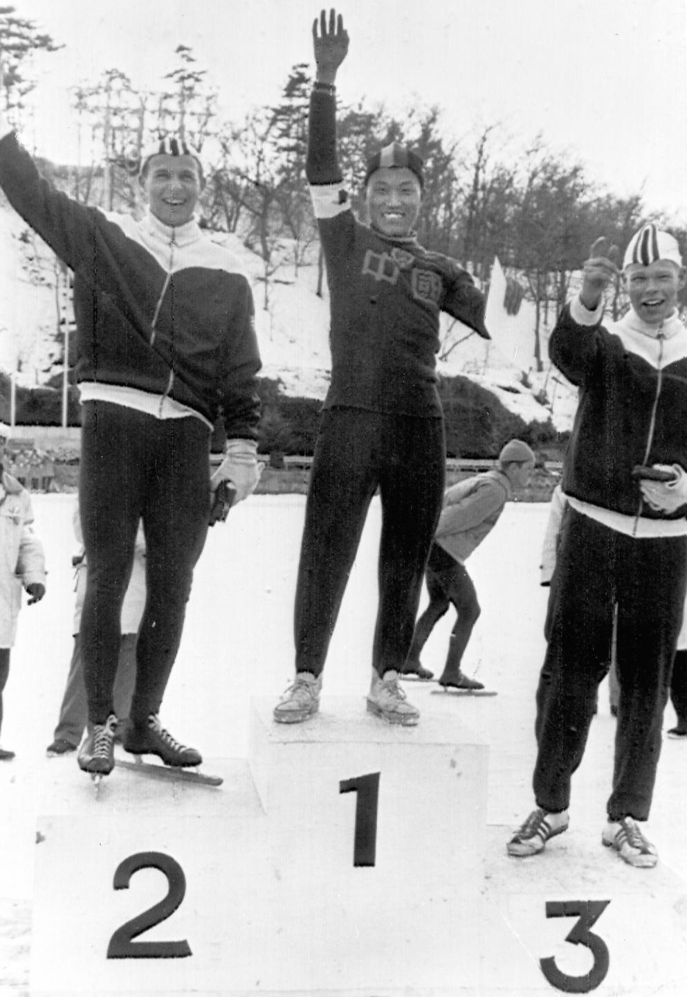 1963年2月24日,在日本舉行的世界速度滑冰錦標(biāo)賽中,羅致煥獲得男子1500米項(xiàng)目冠軍。這是中國(guó)運(yùn)動(dòng)員第一次取得冰雪項(xiàng)目的單項(xiàng)世界冠軍。圖為羅致煥(中)受獎(jiǎng)后向觀眾致意。 新華社發(fā)(資料照片)