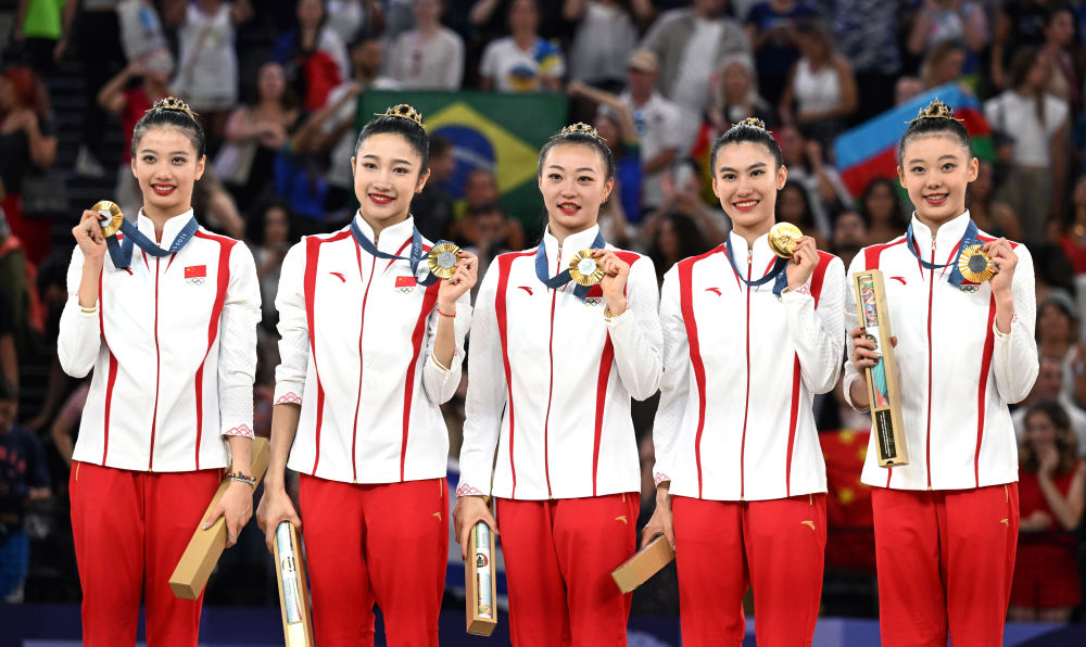 8月10日,中國(guó)隊(duì)在頒獎(jiǎng)儀式上。當(dāng)日,在巴黎奧運(yùn)會(huì)藝術(shù)體操項(xiàng)目集體全能決賽中,中國(guó)隊(duì)獲得冠軍。新華社記者 程敏 攝