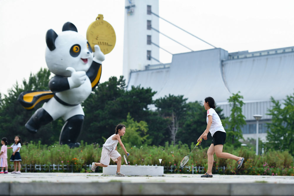 2023年8月20日,市民在位于北京的國(guó)家奧林匹克體育中心小廣場(chǎng)上打羽毛球。國(guó)家奧林匹克體育中心是我國(guó)第一個(gè)承辦大型綜合性國(guó)際體育賽事的體育場(chǎng)館群,為1990年北京亞運(yùn)會(huì)而建。新華社記者 陳鐘昊 攝