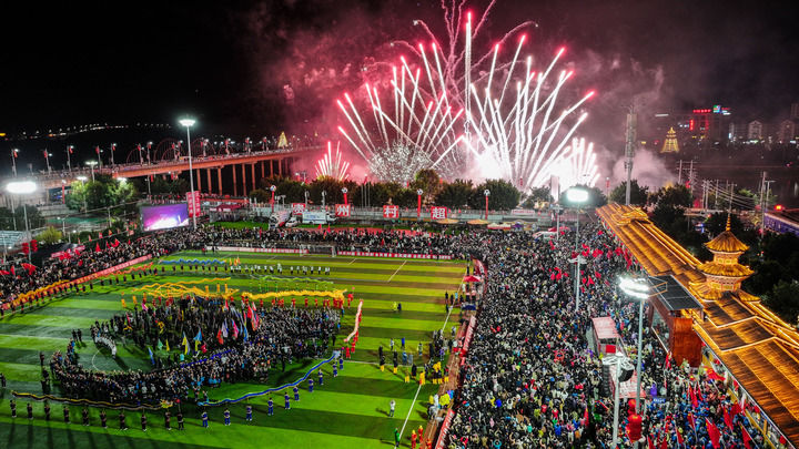 2024年2月3日,在貴州省榕江縣,2024全國“村晚”示范展示活動暨貴州“村超村晚”舉行音樂煙花秀表演(無人機(jī)照片)。新華社記者 劉續(xù) 攝