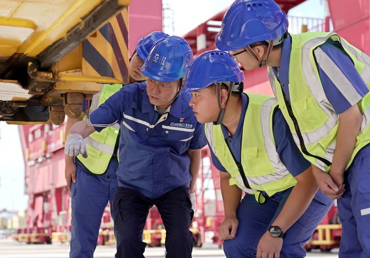 許振超(左二)和團(tuán)隊(duì)成員在山東港口青島港集裝箱碼頭研究傳統(tǒng)集裝箱橋吊的智能化升級(jí)方案(2024年9月2日攝)。新華社發(fā)(閆軍 攝)