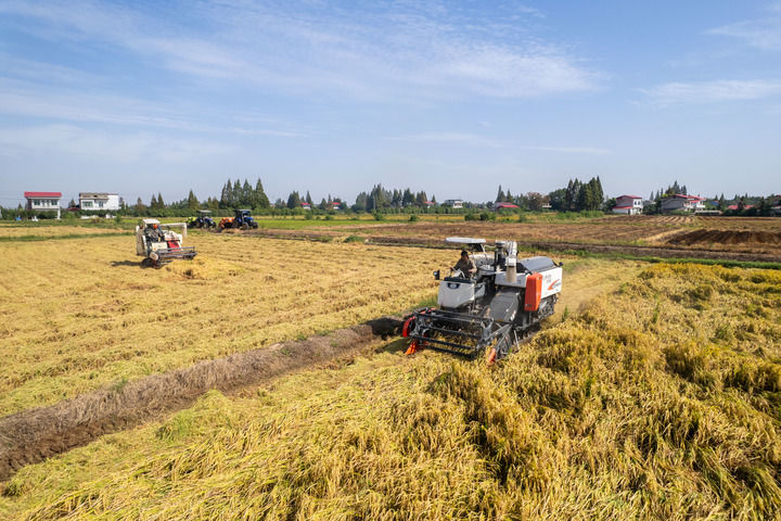 10月2日,湖南省益陽市南縣麻河口鎮(zhèn)蔡家鋪村村民開展水稻機(jī)械收割作業(yè)(無人機(jī)照片)。新華社記者 陳思汗 攝