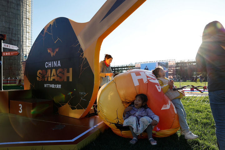 10月1日,孩子們?cè)诖鬂M貫公園玩耍。當(dāng)日,2024年世界乒乓球職業(yè)大聯(lián)盟(WTT)中國(guó)大滿貫比賽繼續(xù)在北京進(jìn)行。新華社記者 王麗莉 攝