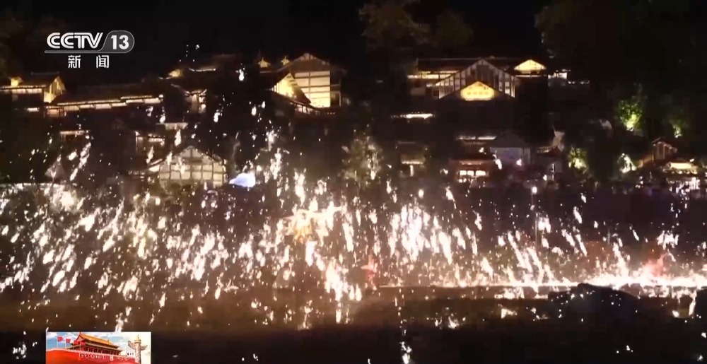 隨著夜幕降臨,非遺打鐵花、篝火狂歡派對等節(jié)目陸續(xù)開始,讓游客感受東方之美、中國之韻。10月1日到7日,烏江寨新增民族盛裝巡游、萬人大合唱、無人機光影秀等內容,從早到晚輪番上演,為游客們呈上一場文化大餐。