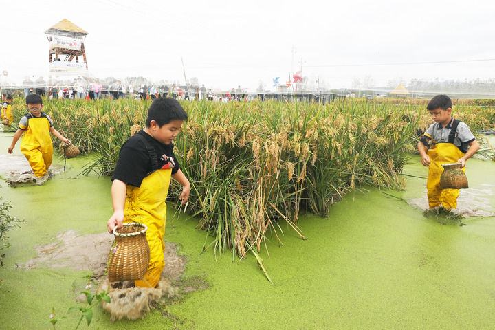10月3日,孩子們?cè)谡憬×x烏市赤岸鎮(zhèn)一處稻魚(yú)共生的稻田里捉魚(yú)。