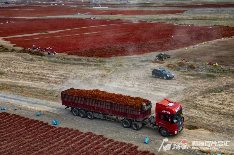 10月3日,貨運(yùn)汽車在沙灣市安集海鎮(zhèn)萬(wàn)畝天然曬場(chǎng)轉(zhuǎn)運(yùn)辣椒(無(wú)人機(jī)攝)。