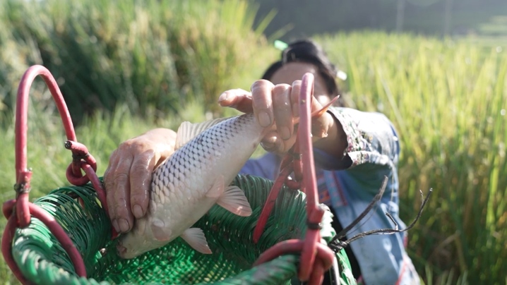 而侗族人民的智慧遠不止于此,他們巧妙地利用當地自然環(huán)境,孕育出獨特的“稻魚鴨”共生稻作文化。從江縣往洞鎮(zhèn)增沖種植養(yǎng)殖專業(yè)合作社負責人石剛勇說,“種植一季稻、放養(yǎng)一批魚、飼養(yǎng)一批鴨,稻魚鴨系統能夠和諧共存,是因為打了時間差。種稻的時候放魚苗,魚苗能清理土壤,讓土壤疏松。等到農歷的三月下旬或四月上旬,再放入鴨苗。此時的秧苗已經長成,剛出生不久的鴨苗不會損壞秧苗,鴨子吃田里的蟲子,它們的糞便喂魚,魚糞又滋養(yǎng)稻谷,這就形成了一個完美的生態(tài)循環(huán)?!?/p>