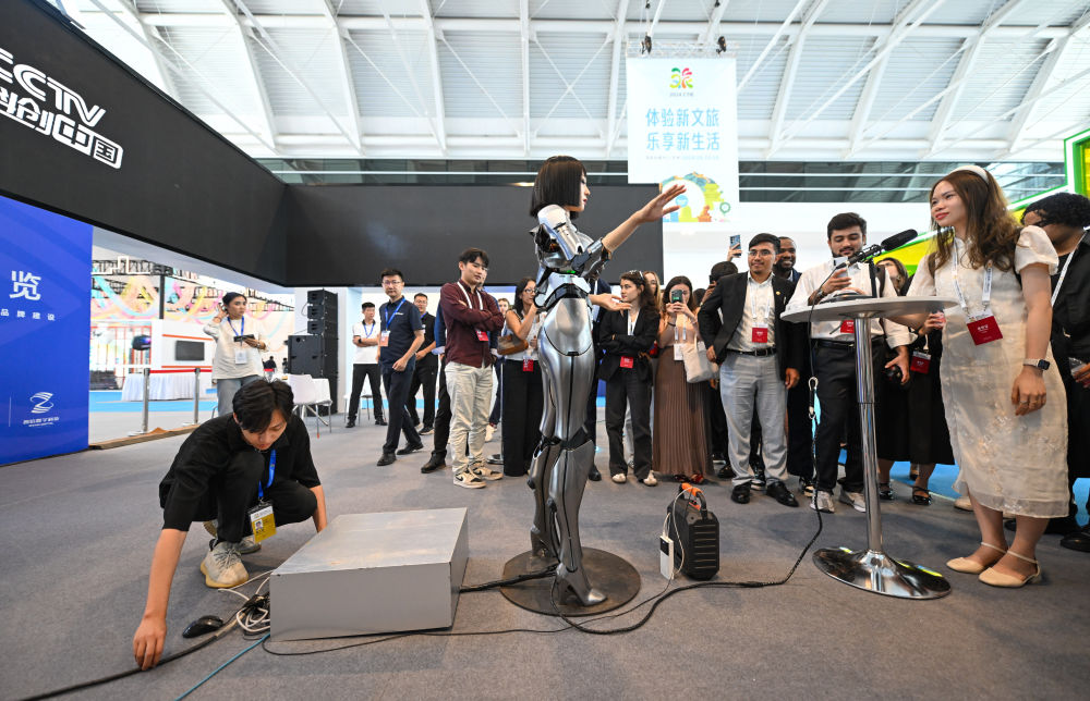 會(huì)展搭建師在天津舉辦的中國(guó)文化旅游產(chǎn)業(yè)博覽會(huì)現(xiàn)場(chǎng)維護(hù)AI機(jī)器人互動(dòng)設(shè)備(9月13日攝)。新華社記者 孫凡越 攝