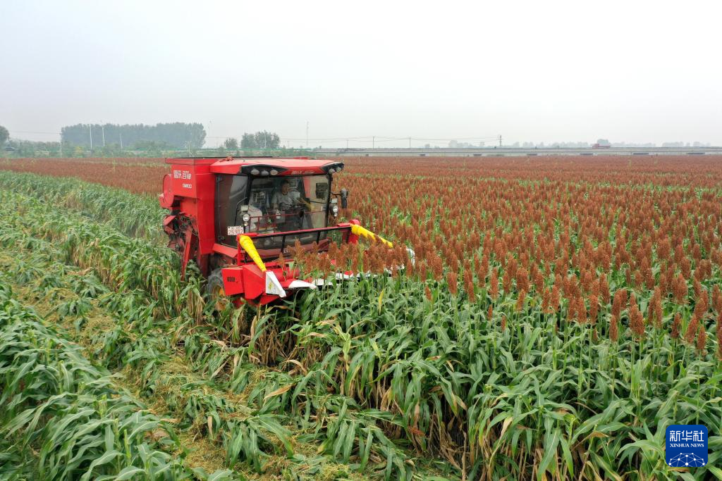 10月7日,在河北省邢臺(tái)市南和區(qū)和陽(yáng)鎮(zhèn)東關(guān)村,農(nóng)民駕駛收割機(jī)收獲高粱(無人機(jī)照片)。新華社記者 王曉 攝
