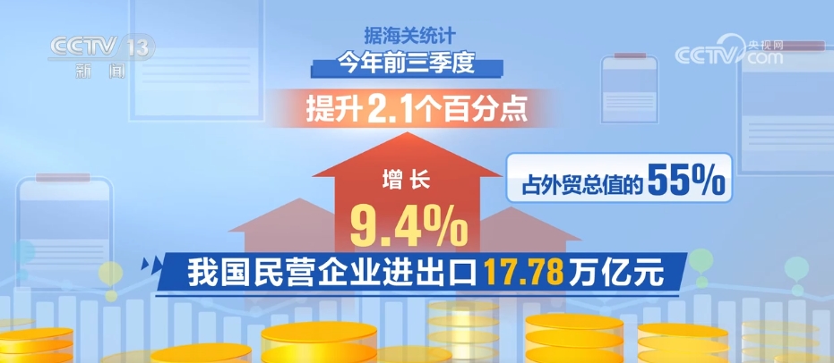 據(jù)海關(guān)統(tǒng)計,今年前三季度,我國民營企業(yè)進(jìn)出口17.78萬億元,增長9.4%,占外貿(mào)總值的55%,提升2.1個百分點;外商投資企業(yè)進(jìn)出口9.53萬億元,增長1.1%,連續(xù)兩個季度增長;國有企業(yè)進(jìn)出口4.95萬億元,增長0.1%。