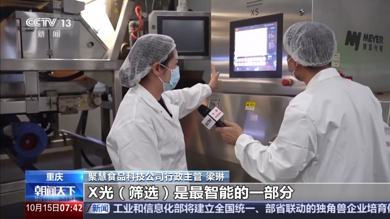 重慶聚慧食品科技公司行政主管 梁琳:X光篩選是最智能的一部分,可以達到99%的挑選率,后面再通過兩道人工篩選,保證辣椒100%去除異質(zhì),送到生產(chǎn)線。