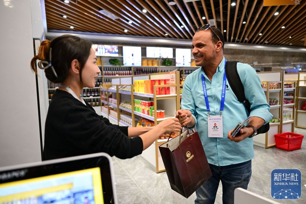 10月15日,與會嘉賓在新疆喀什跨境電商進(jìn)出口商品展示交易中心購物。