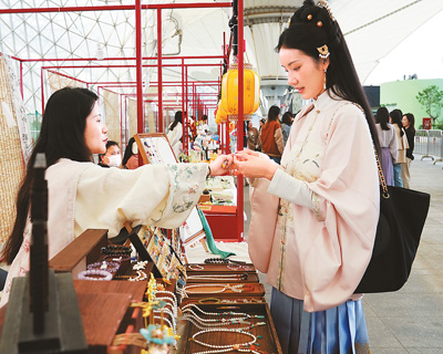 華服愛好者在二〇二四年“中國(guó)華服周·滬上繁花”國(guó)風(fēng)市集上挑選飾品。新華社記者 劉穎攝