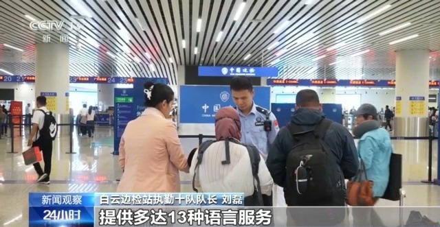 白云邊檢站執(zhí)勤十隊(duì)隊(duì)長(zhǎng) 劉磊:現(xiàn)場(chǎng)這邊的8條通道設(shè)置為廣交會(huì)專用通道,包括從廊橋到通道前,全程都設(shè)置了指引標(biāo)志和引導(dǎo)民警,提供多達(dá)13種語(yǔ)言服務(wù)。
