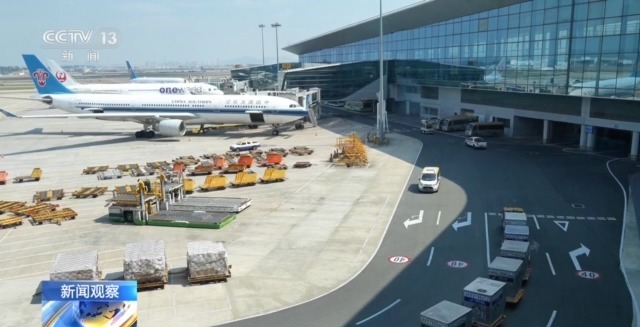 東莞港國(guó)際空運(yùn)有限公司副總經(jīng)理 蕭智亮:我們空港中心是全球首個(gè)直達(dá)機(jī)場(chǎng)空側(cè)的跨關(guān)境??章?lián)運(yùn)項(xiàng)目,貨物在空港中心完成裝車,送達(dá)我們的專用碼頭,通過海運(yùn)的方式到達(dá)香港國(guó)際機(jī)場(chǎng)飛往全球。