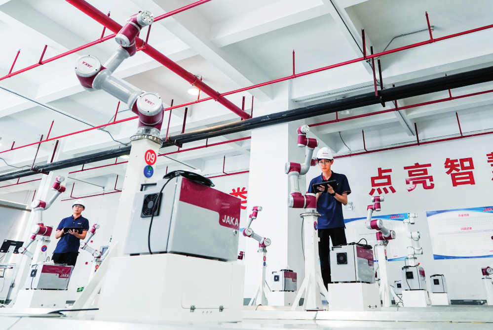 在位于江蘇省常州市武進(jìn)區(qū)的常州節(jié)卡智能裝備有限公司制造基地,工作人員在對(duì)柔性智能協(xié)作機(jī)器人進(jìn)行全系列測(cè)試(2024 年 6 月 14 日攝) 李博攝 / 本刊
