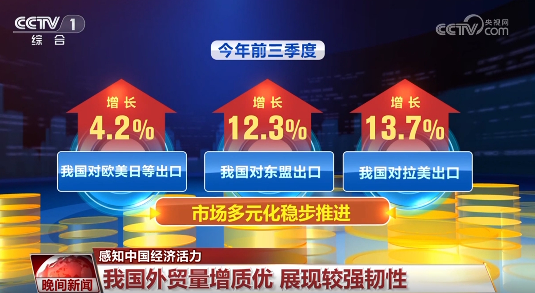 今年以來(lái),我國(guó)外貿(mào)量增質(zhì)優(yōu),展現(xiàn)較強(qiáng)韌性。世貿(mào)組織最新數(shù)據(jù)顯示:上半年我國(guó)出口國(guó)際市場(chǎng)份額為14.3%,同比提高0.4個(gè)百分點(diǎn)。前三季度,我國(guó)與160多個(gè)國(guó)家和地區(qū)貿(mào)易實(shí)現(xiàn)增長(zhǎng),對(duì)歐美日等傳統(tǒng)市場(chǎng)出口增長(zhǎng)了4.2%,對(duì)東盟、拉美等新興市場(chǎng)出口分別增長(zhǎng)了12.3%和13.7%,市場(chǎng)多元化穩(wěn)步推進(jìn)。在深圳鹽田港,僅今年前9個(gè)月就新增了16條航線。