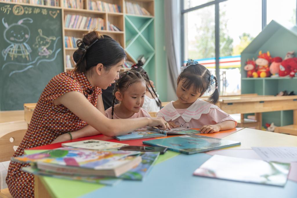 2024年9月25日,在重慶市江津區(qū)珞璜鎮(zhèn)碑亭社區(qū),社區(qū)居民郭明會(huì)(左一)帶著小孩閱讀用社保卡借閱的圖書(shū)。新華社記者 黃偉 攝