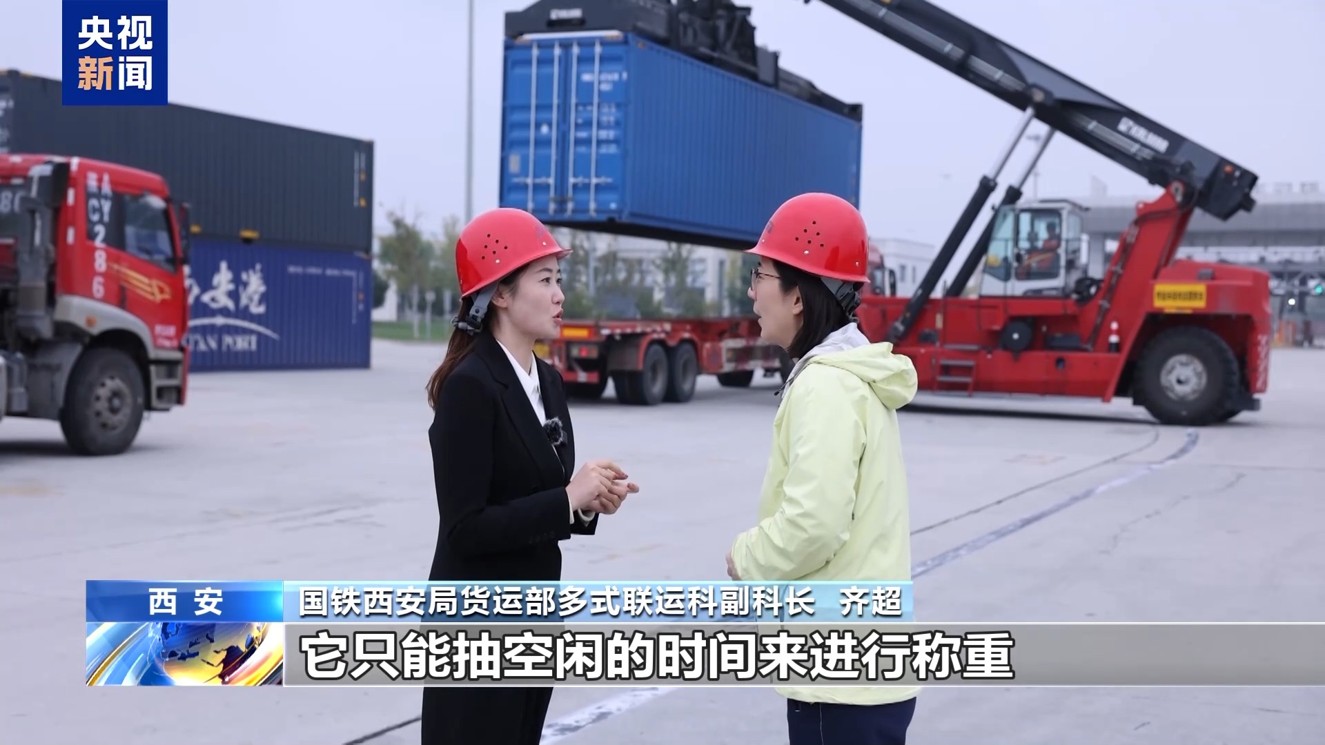 國(guó)鐵西安局貨運(yùn)部多式聯(lián)運(yùn)科副科長(zhǎng) 齊超:因?yàn)辇堥T(mén)吊的主要任務(wù)是為了裝卸火車(chē),只能抽空閑的時(shí)間進(jìn)行稱(chēng)重,所以集卡司機(jī)等待的時(shí)間非常長(zhǎng),而且沒(méi)有確定性,也不知道什么時(shí)候能稱(chēng)到自己。