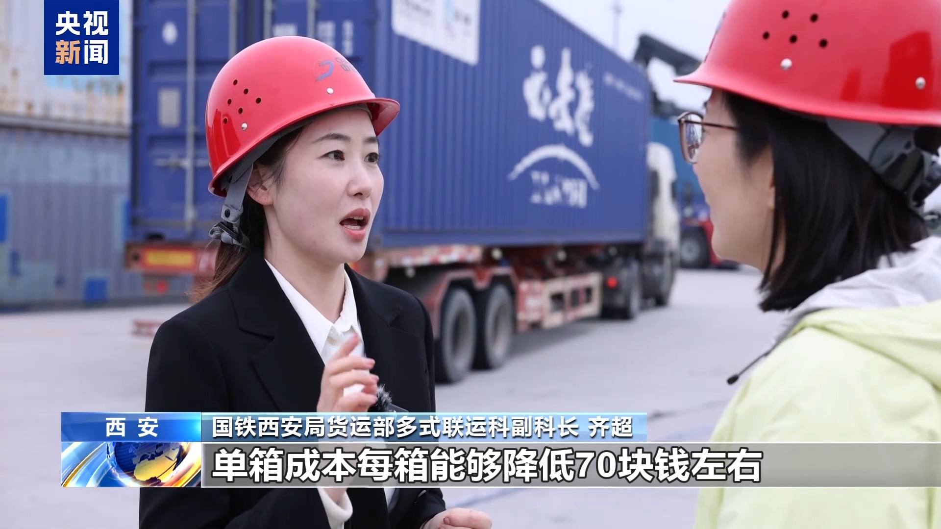 國(guó)鐵西安局貨運(yùn)部多式聯(lián)運(yùn)科副科長(zhǎng) 齊超:這個(gè)降本非常明顯,比如原來(lái)可能拉一次200塊錢(qián),一天可能最多跑兩趟,賺400塊錢(qián)。如果現(xiàn)在能一天跑五趟,就能賺1000塊錢(qián),那單趟成本就愿意降低。我們大概測(cè)算了一下,經(jīng)過(guò)改善之后,單箱成本每箱能夠降低70塊錢(qián)左右。