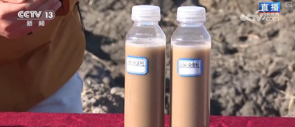 這片田采用的是有機(jī)硅改良劑來治理的鹽堿地,選取同地塊的鹽堿土溶于水中,加入有機(jī)硅后,土壤和水快速分層??梢钥吹?,有機(jī)硅具有較強(qiáng)的親土性,可以和土壤包裹一起,阻斷鹽分吸收,從而達(dá)到降堿和改變土壤板結(jié)的作用。這能讓水稻更好地扎根生長,渾濁的水變清澈,也可以增加作物的光合作用,有效治理重度鹽堿土壤。