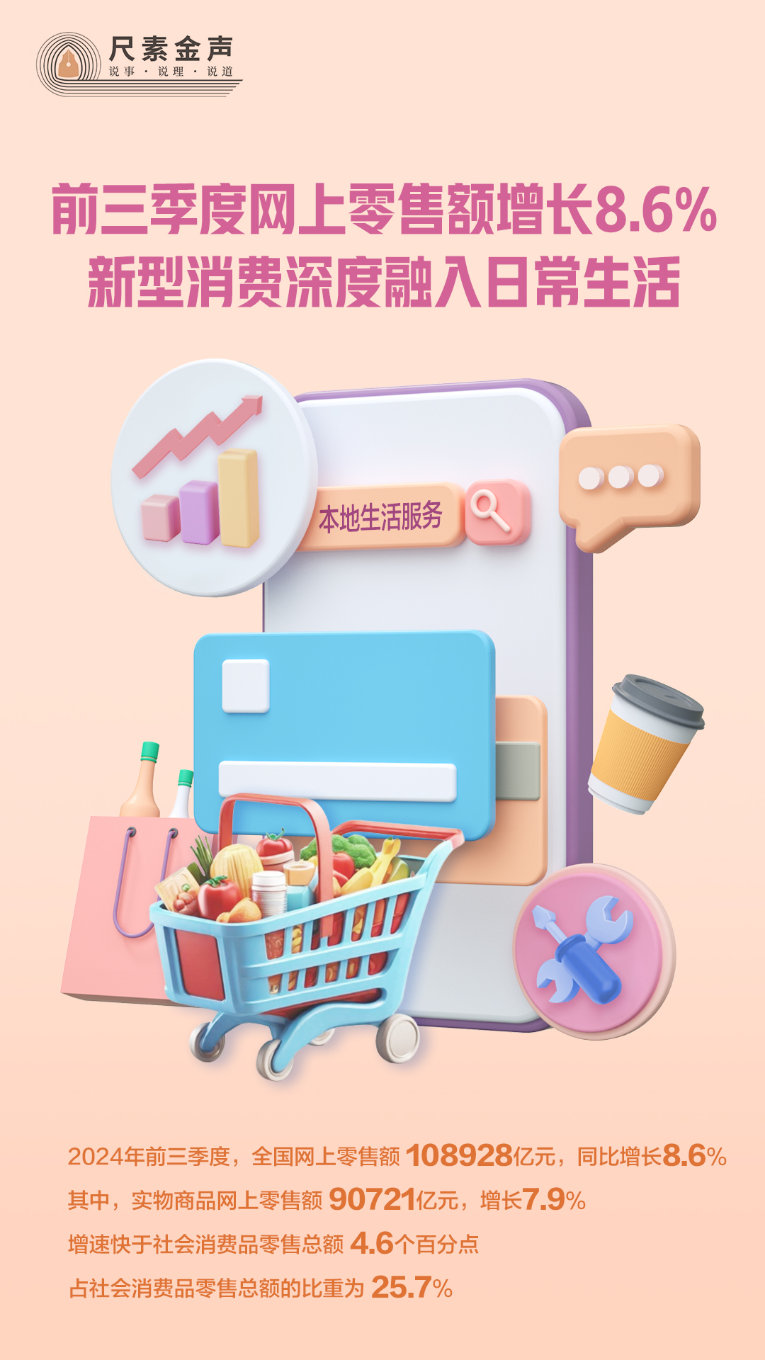 最新數(shù)據(jù)顯示,今年前三季度,全國網(wǎng)上零售額108928億元,同比增長8.6%。其中,實物商品網(wǎng)上零售額90721億元,增長7.9%,增速快于社會消費品零售總額4.6個百分點,占社會消費品零售總額的比重為25.7%。本地生活服務(wù)等新型消費快速增長,對線上消費增長起到明顯的拉動作用。