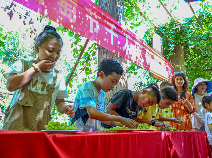 游客在新疆吐魯番葡萄溝景區(qū)參加吃葡萄大賽(8月17日攝)。新華社記者 陳朔 攝