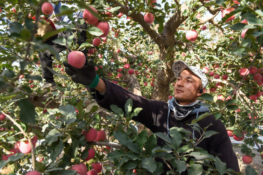 10月23日,在新疆阿克蘇地區(qū)紅旗坡農(nóng)場,果農(nóng)在采摘蘋果。新華社記者 高晗 攝