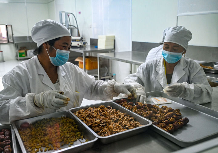 在新疆喀什地區(qū)巴楚縣一家合作社,職工在無菌車間內(nèi)制作棗夾核桃(9月8日攝)。新華社記者 陳朔 攝