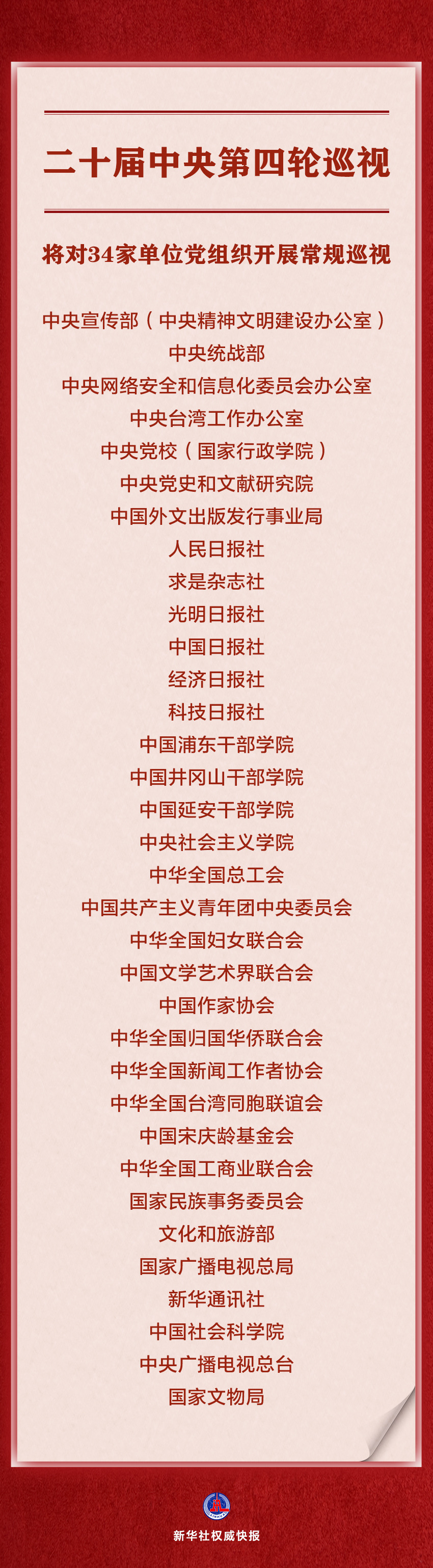 經(jīng)黨中央批準(zhǔn),二十屆中央第四輪巡視將對中央宣傳部(中央精神文明建設(shè)辦公室)、中央統(tǒng)戰(zhàn)部、中央網(wǎng)絡(luò)安全和信息化委員會辦公室、中央臺灣工作辦公室、中央黨校(國家行政學(xué)院)、中央黨史和文獻(xiàn)研究院、中國外文出版發(fā)行事業(yè)局、人民日報社、求是雜志社、光明日報社、中國日報社、經(jīng)濟(jì)日報社、科技日報社、中國浦東干部學(xué)院、中國井岡山干部學(xué)院、中國延安干部學(xué)院、中央社會主義學(xué)院、中華全國總工會、中國共產(chǎn)主義青年團(tuán)中央委員會、中華全國婦女聯(lián)合會、中國文學(xué)藝術(shù)界聯(lián)合會、中國作家協(xié)會、中華全國歸國華僑聯(lián)合會、中華全國新聞工作者協(xié)會、中華全國臺灣同胞聯(lián)誼會、中國宋慶齡基金會、中華全國工商業(yè)聯(lián)合會、國家民族事務(wù)委員會、文化和旅游部、國家廣播電視總局、新華通訊社、中國社會科學(xué)院、中央廣播電視總臺、國家文物局等34家單位黨組織開展常規(guī)巡視。