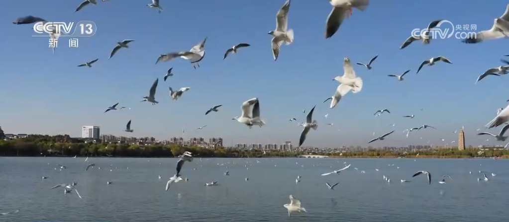 在銀川的北塔湖公園,成群的紅嘴鷗或在湖面上盤旋、嬉戲,或游蕩在水面上享受著秋日的陽光,這一幕吸引了不少攝影愛好者和市民駐足賞鷗。