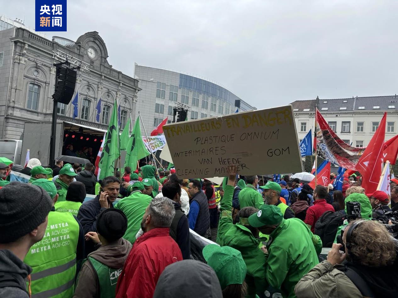 9月16日,比利時(shí)一家奧迪工廠工人在布魯塞爾市中心的盧森堡廣場(chǎng)舉行示威活動(dòng)(總臺(tái)記者顧鑫拍攝)