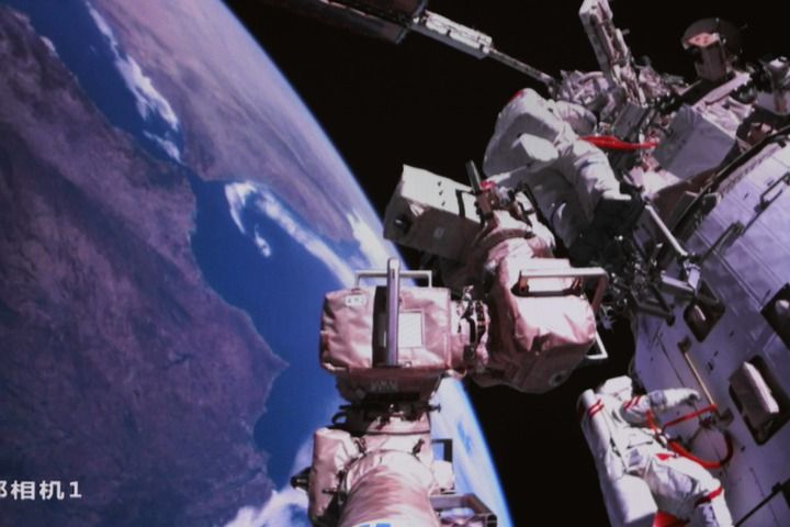 他們二人身著我國(guó)新一代“飛天”艙外航天服,上面的航天員簽名見證了中國(guó)航天一個(gè)又一個(gè)紀(jì)錄——