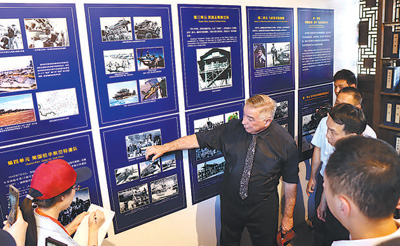 格林(左二)在長汀舉辦的飛虎隊(duì)主題歷史圖片展上講述歷史照片背后的故事。