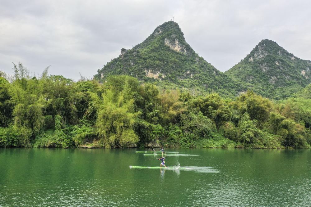 河池學院獨竹漂隊在環(huán)江河上表演。新華社發(fā)(高東風 攝)