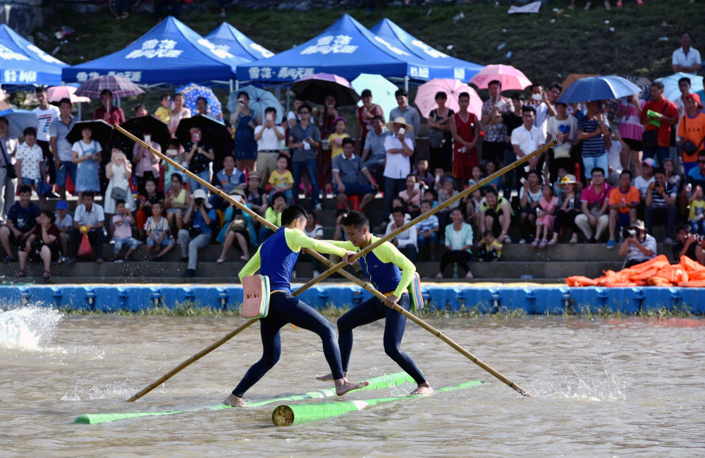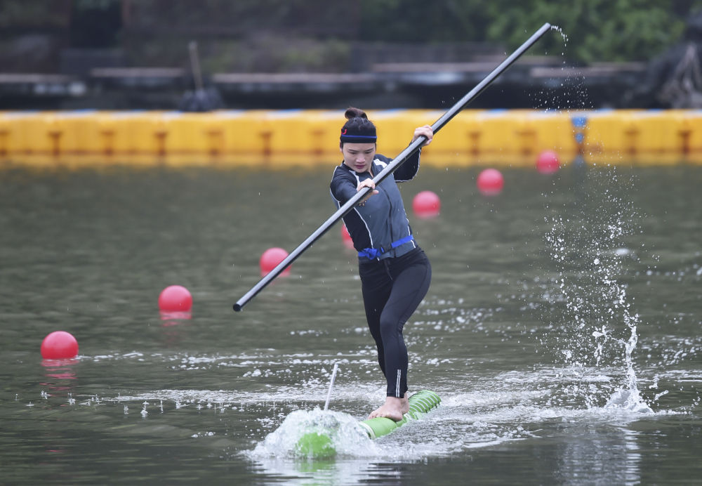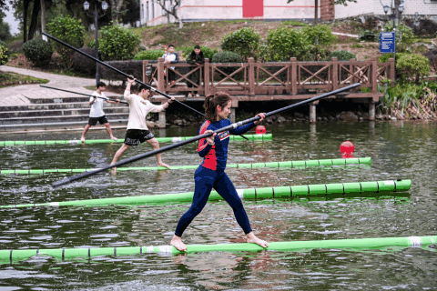 2019年4月4日,河池學院獨竹漂隊的隊員在廣西桂林市舉行的“民族體育炫”系列比賽中參加獨竹漂項目的比賽。