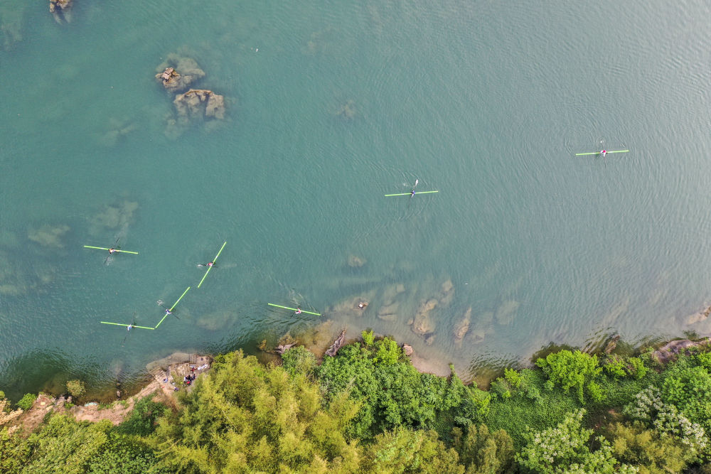 4月9日,河池學院獨竹漂隊的隊員們在自然河道里訓練。