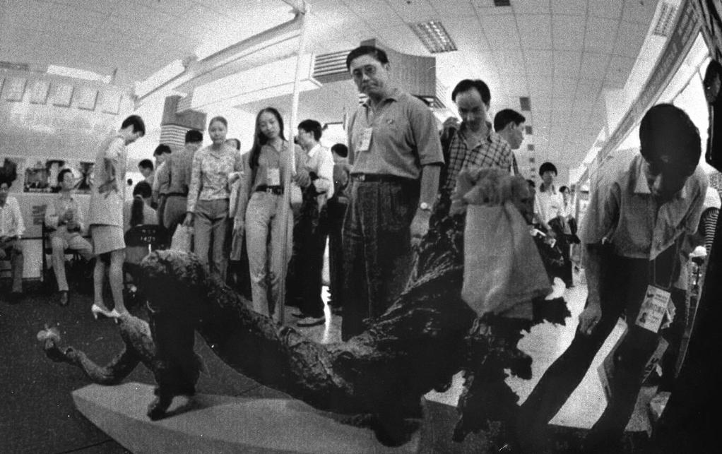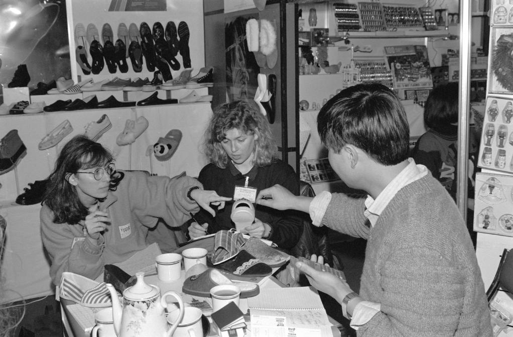 1991年3月,在上海舉行的首屆華東出口商品交易會(后發(fā)展為華東進出口商品交易會,簡稱“華交會”)上,兩名意大利客商同浙江省輕工業(yè)品進出口公司代表洽談業(yè)務。新華社記者 柳中央 攝