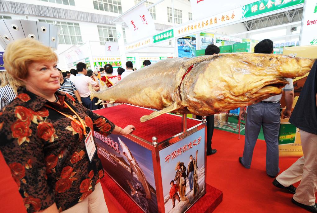 2008年6月15日,在第19屆中國哈爾濱國際經濟貿易洽談會(后與中國-俄羅斯博覽會合并舉辦)上,一位客商在鱘鰉魚標本旁留影。新華社記者 王建威 攝