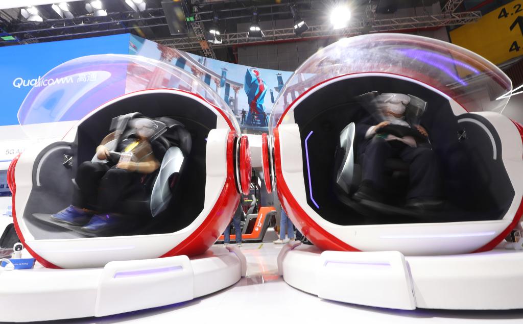 2022年11月5日,參觀者在第五屆進博會技術裝備展區(qū)體驗一款VR游戲座椅。新華社記者 方喆 攝
