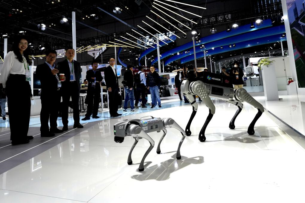 2023年11月7日,觀眾在第六屆進博會技術裝備展區(qū)觀看智能機器狗。新華社記者 張建松 攝